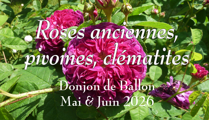 "Roses anciennes, pivoines et clématites au Donjon de Ballon"